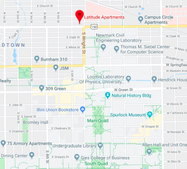 Latitude是UIUC校外的知名现代化奢华公寓,说是校外,其实与学校工院仅一街之隔,且有门禁和24小时的快递揽件室,安全性非常高,是很多工院学生的心头好: 步行3分钟到达Electrical and Computer Engineering Building(电气与计算机工程系大楼),8分钟到达Thomas M. Siebel Center(计算机系大楼)或Grainger Engineering Library(工院图书馆)。除了工院, 想去学校中心最繁华的商业街Green Street及Altgeld Hall(数学系大楼)仅需步行11分钟。出公寓步行4分钟到公交站后,搭乘公交车5分钟即可到达Gies College of Business(商院)附近。公寓更为有车的小伙伴们提供了室内和室外两种类型的停车位。